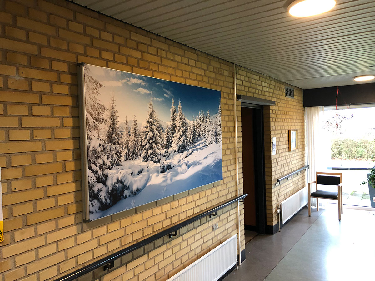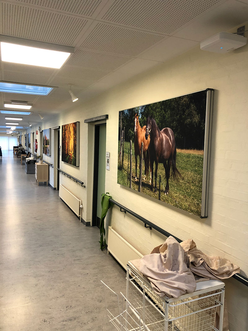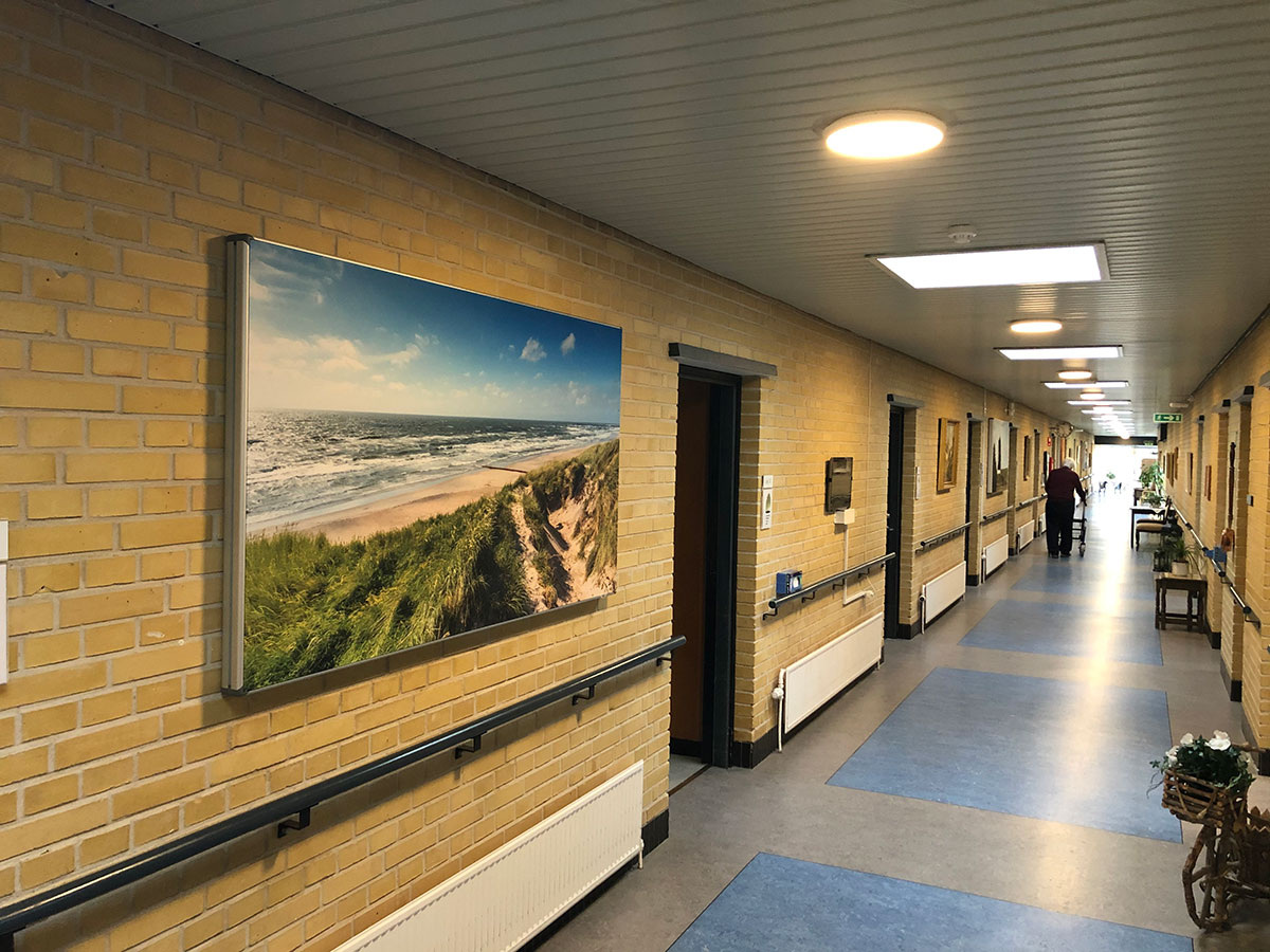 Optimal lyddæmpning kombineret med et genkendeligt og inspirerende visuelt miljø. De genkendelige motiver/design kan være dialogskabende, og på den måde skabes den positive distraktion i beboernes hverdag.