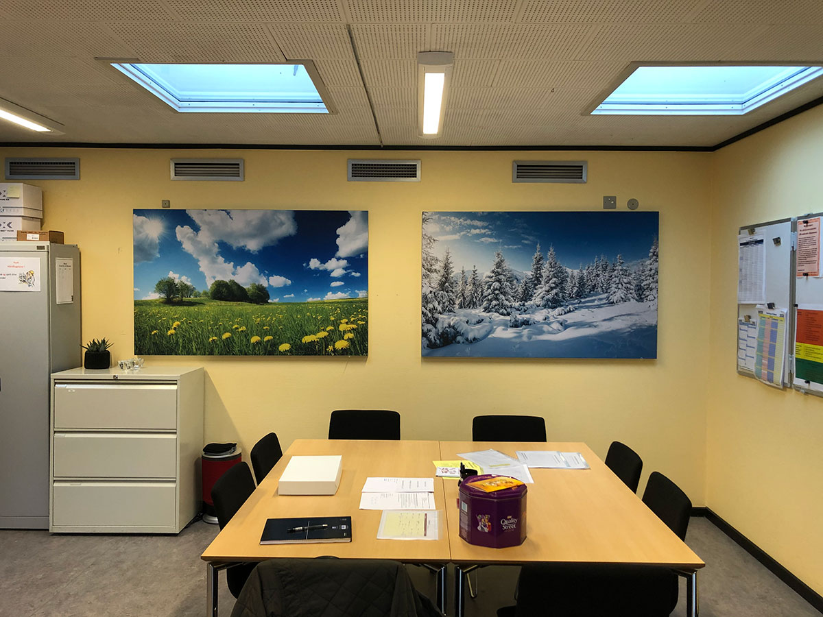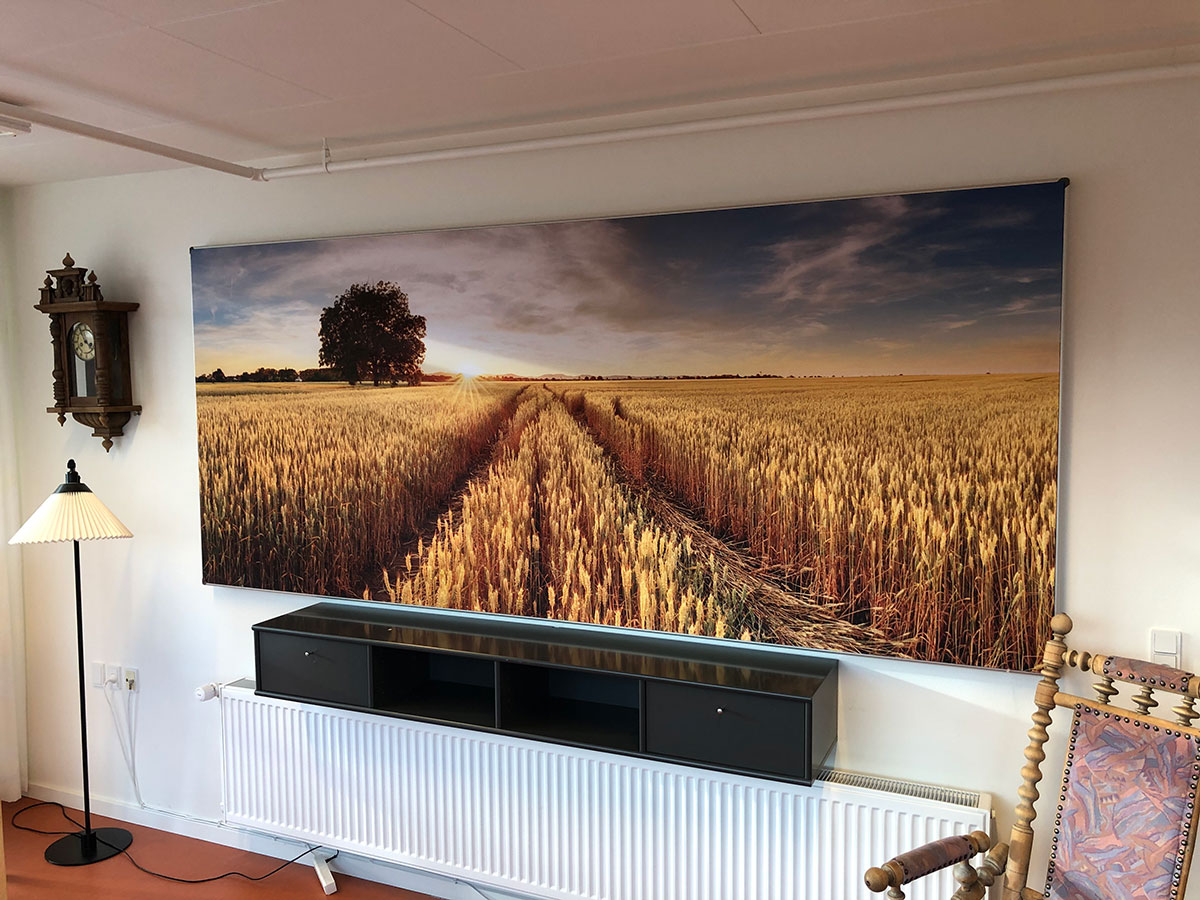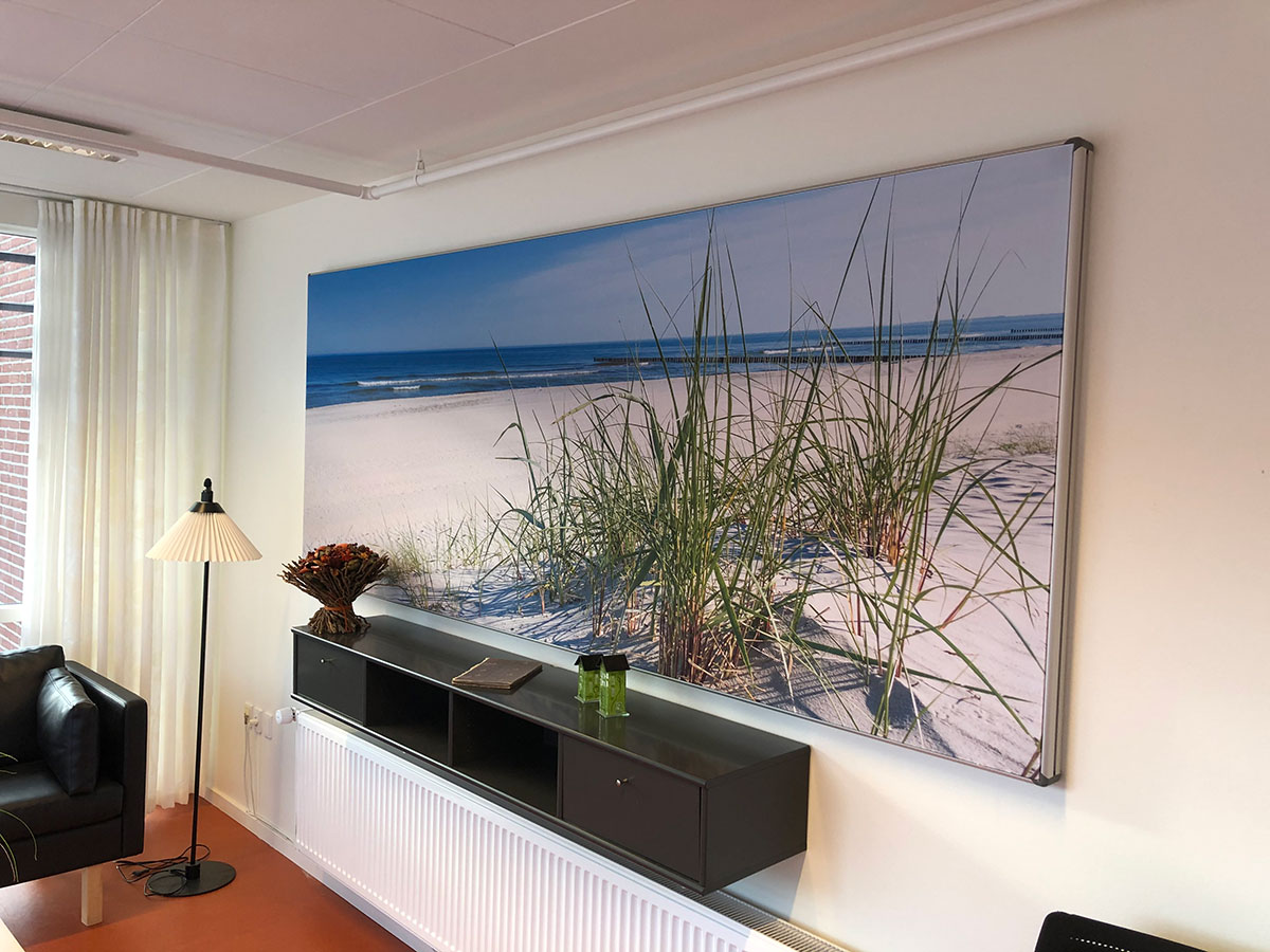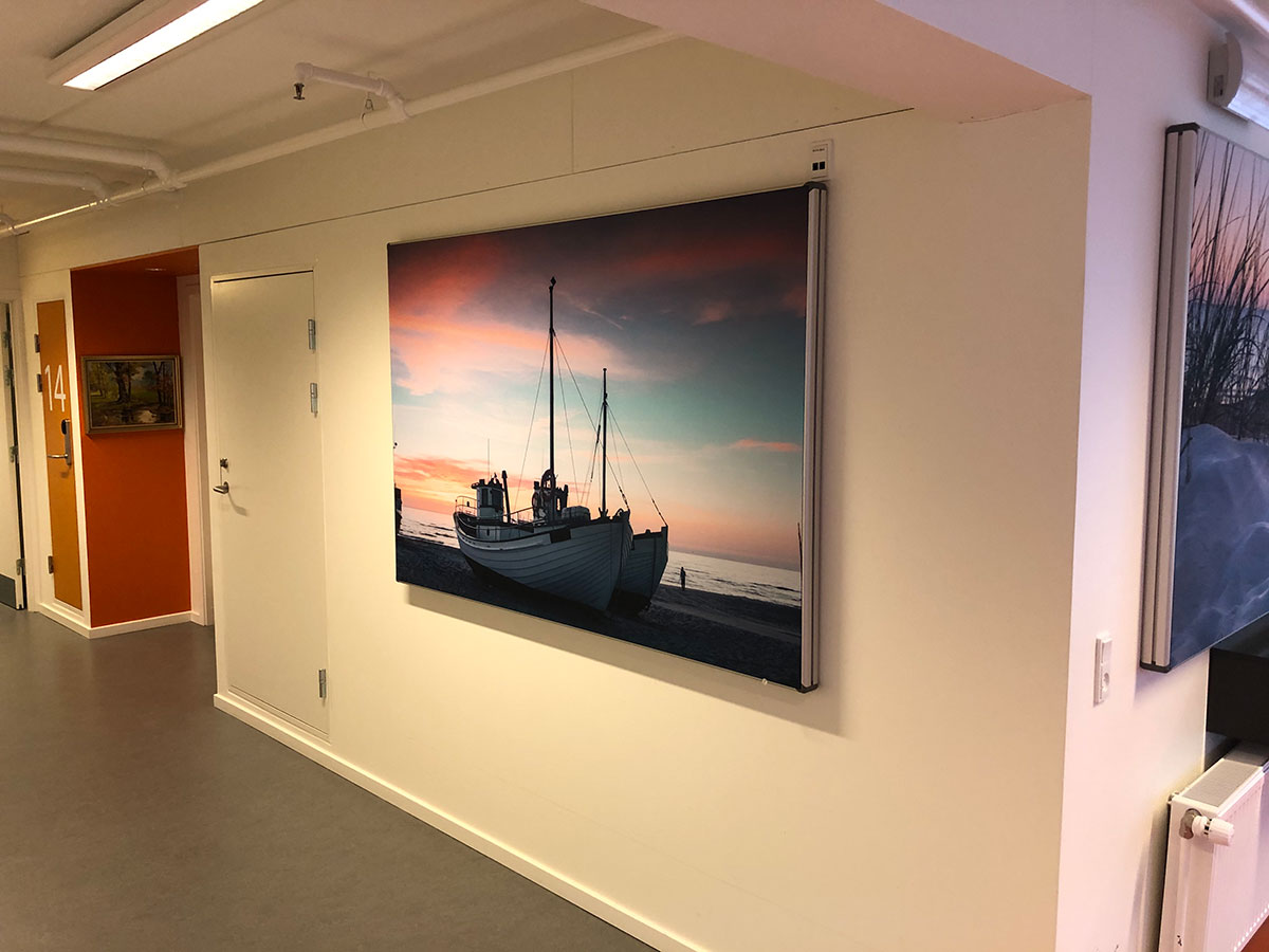 Alle vores akustikløsninger kan leveres med mulighed for at udskifte motivet (den printede dug). På den måde giver det jer dynamik og fleksibilitet i hverdagen. Har jeres akustikpaneler samme størrelse, kan I udskifte og bytte rundt på den printede dug, og derved ændre det visuelle udtryk på forskellige afdelinger. Vi har bl.a. tidligere leveret printede duge med forårs-, sommer-, efterårs- og vintermotiver, som skiftes efter årstiden.