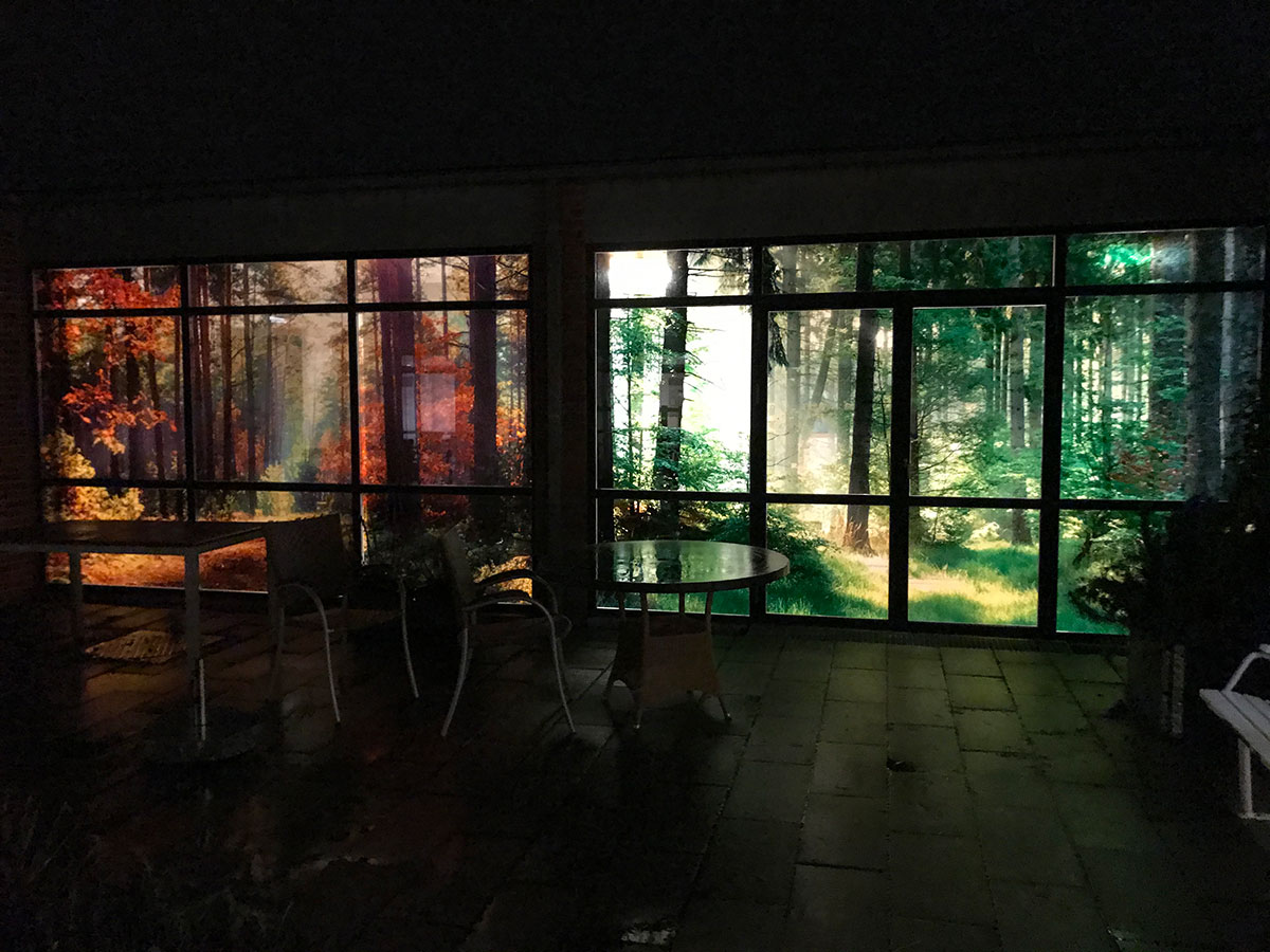 ”Lige overfor fællesrummet var personaleomklædningen. Når personalet havde fri, kunne man fra afdelingen se igennem de store glaspartier, når alle gik hjem. Det medførte voldsom uro, og beboere der fik travlt, for de skulle jo også hjem. Vi fik sat folie på de store vinduespartier, med billede af forår og efterårsskov. Det har bevirket, at beboerne ikke længere kan følge med i hvem der går på gangen, og de kan samtale om forårs- og efterårsbillederne af skoven”.