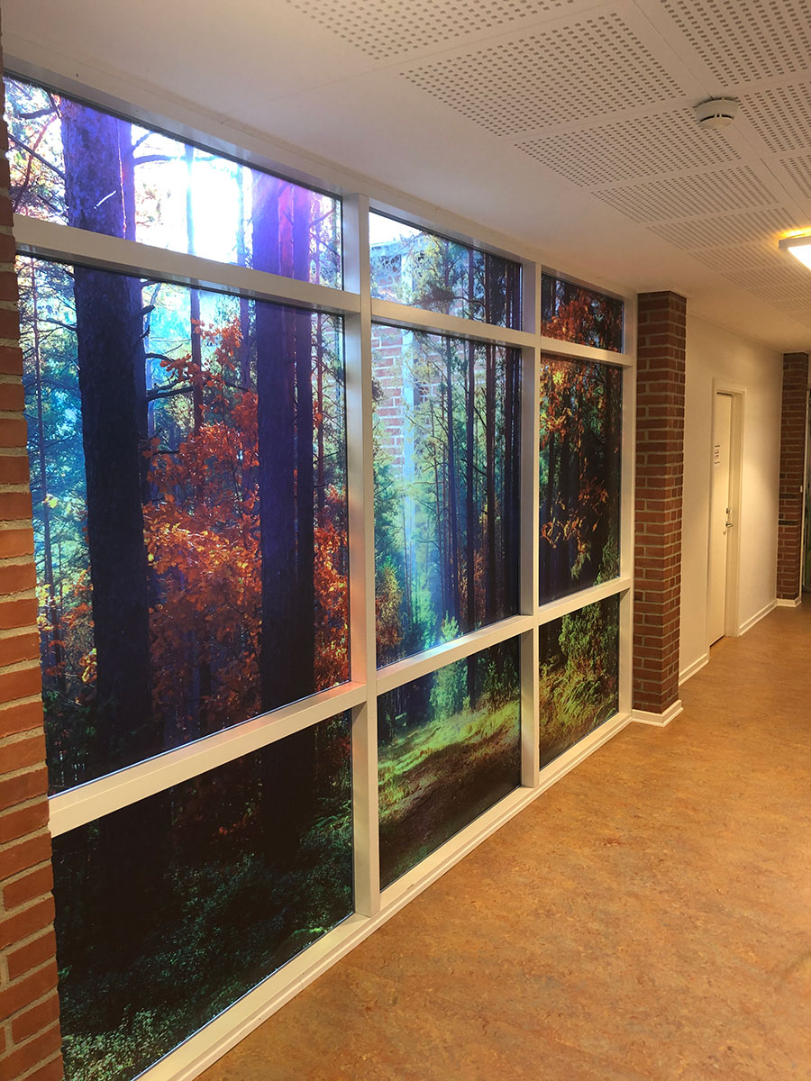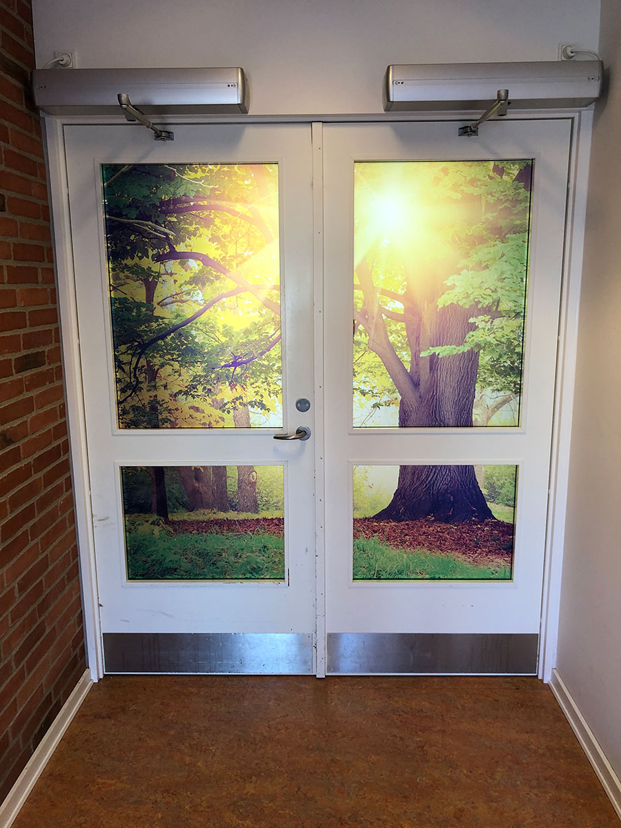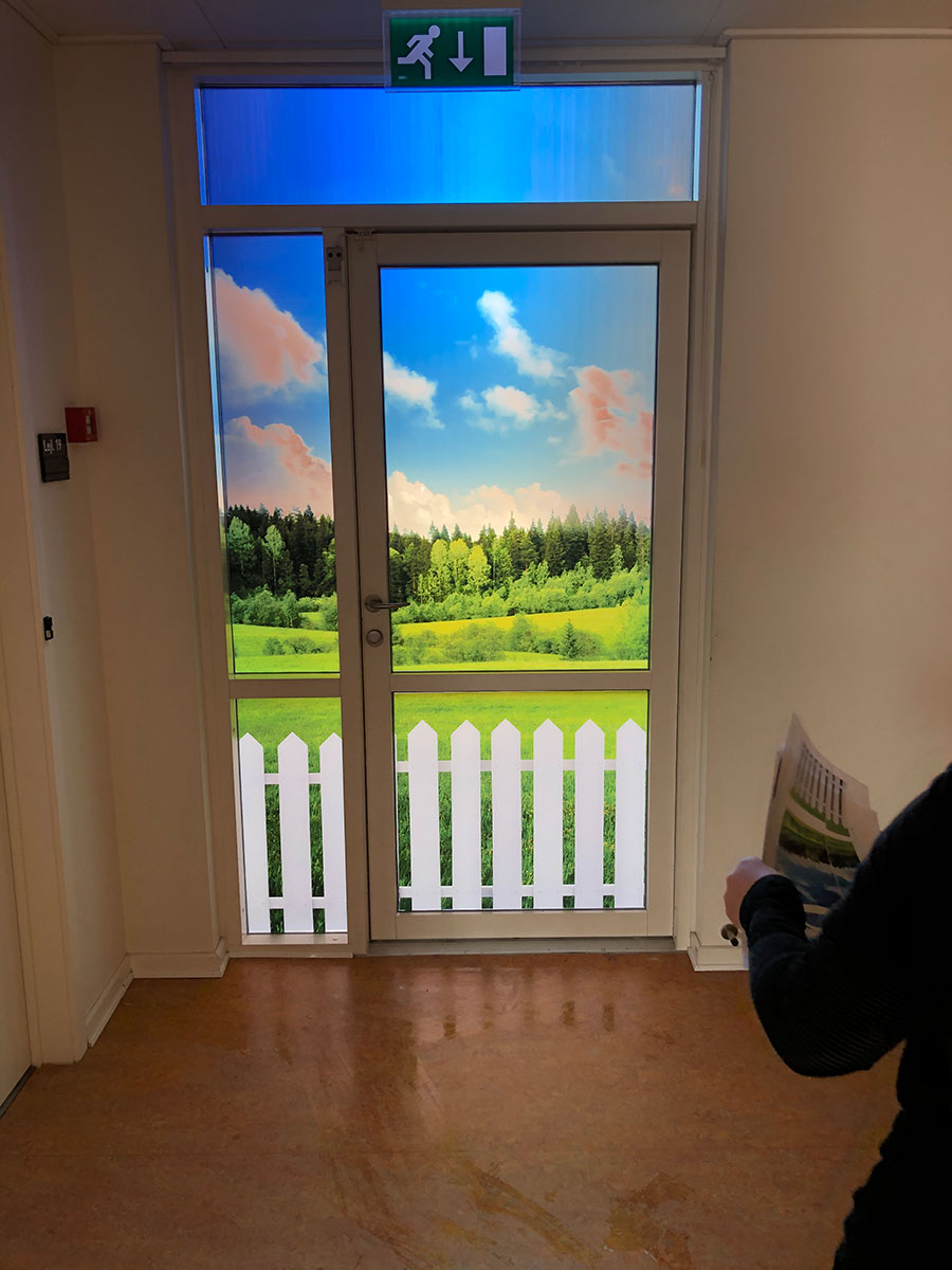 ”Vi har fået folie med flotte billeder sat op på rigtig mange af vores døre. Det har skabt ro og ikke så mange forstyrrelser i afdelingerne, da beboerne ikke længere går fra afdeling til afdeling. Derimod har de nu fået nogle billeder, der kan samtales om, når man kommer hen til dørene”.