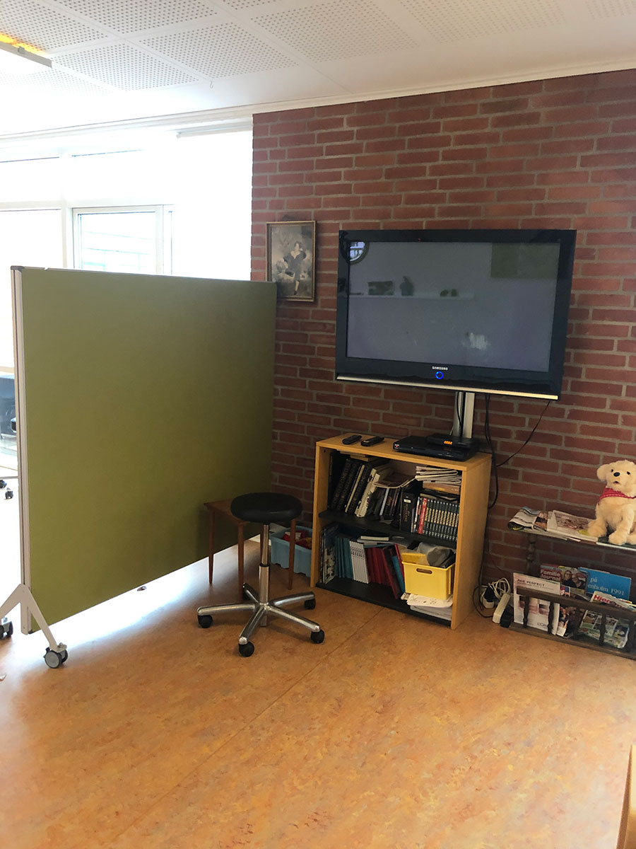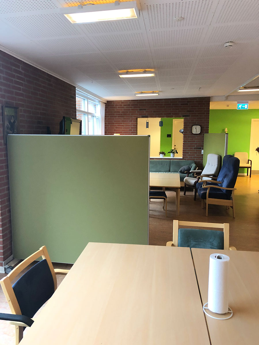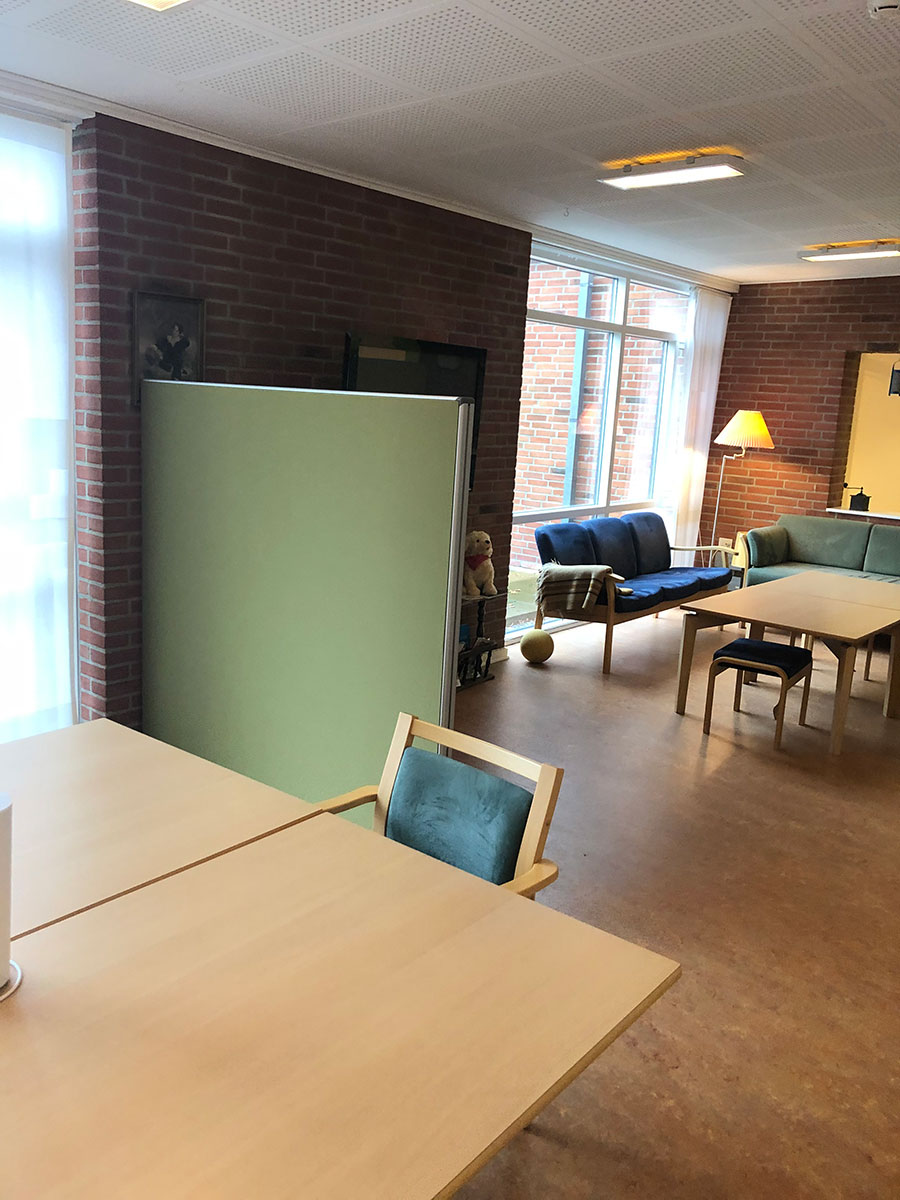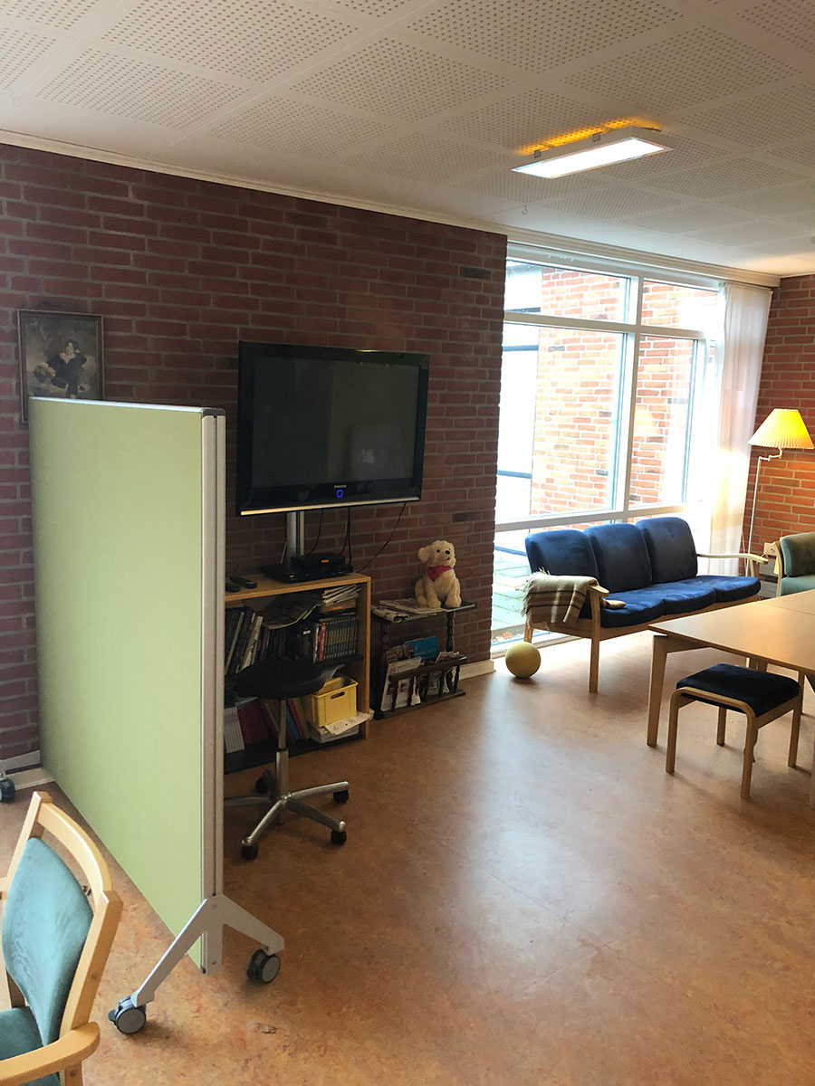 ”Plejecentret Valdemarsgade havde problemer med et stort fællesrum, der var bygget til aflastningspladser, uden mulighed for hyggekroge. Det gav voldsom uro, og det var ikke så let at skabe hygge om aftenen. Vi fik i forbindelse med projektet en del akustik-skillevægge med en beroligende grøn farve, som vi har anvendt til at dele fællesrummet op i et spiserum og en stue med fjernsyn. Det har givet en højere grad af ro og hygge i rummet. Skillevæggene bruges også i resten af plejecenteret, når der er behov for afskærmning for stimuli”.